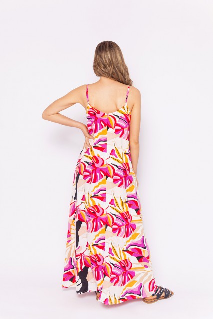 MÁS INFORMACION Realizado en Voile estampado con motivo de hojas. Bretel finito con regulador metálico. Calce over size, súper evasé. Bolsillos laterales. Hermosa paleta de color de alta tendencia.