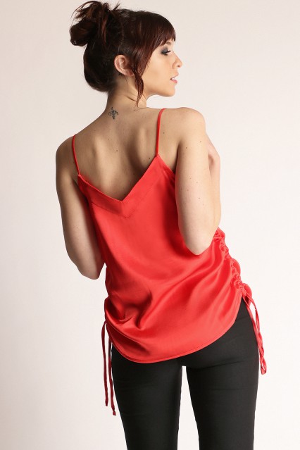 MÁS INFORMACION Realizado en Saten pesado que aporta excelente caída y suave mano a la prenda. Formato evasé con jareta en laterales para generar efecto drapeado. Escote en V en delantero y espalda con vista interna. Bretel fino con cinta aterciopelada al tono. Su materialidad aporta el brillo ideal para un look de noche.