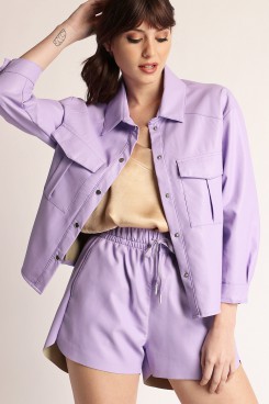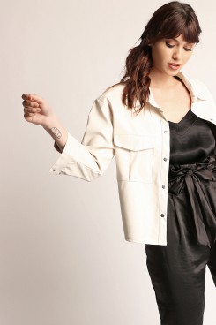 MÁS INFORMACION Realizado en Cuero Ecológico . Formato cuadrado. Bolsillos plaqué en delantero. Broches snaps metálicos. Ruedo suavemente curvo. Una prenda súper canchera para crear infinidad de looks esta temporada.