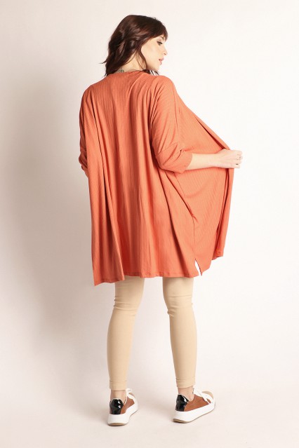 MÁS INFORMACION Realizado en Lanilla labrada. Formato cuadrado. Manga 3/4. Ruedo recto, con tajos laterales.Largo debajo de la cadera.