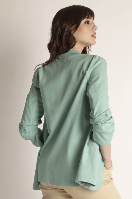 MÁS INFORMACION Realizado en Lino . De corte recto. Largo debajo de la cadera. Bolsillo ojal en delantero. Manga con drapeado efecto arremangado, con solapa. Una prenda liviana, y super canchera para lucir esta temporada.