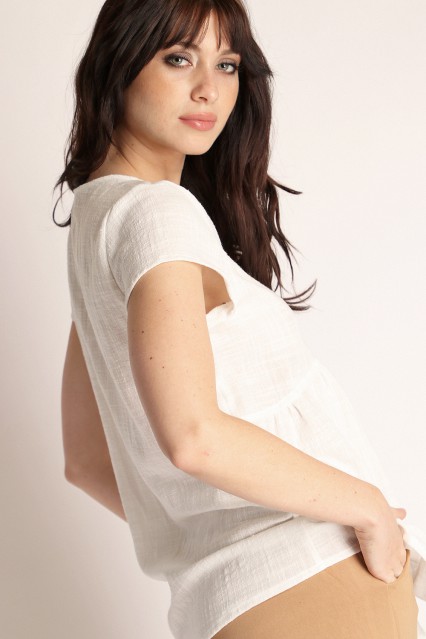 MÁS INFORMACION Realizado en Bambula . Escote en V con cartera y botón de pasta marmolado. Manga corta. Formato evasé con recortes en diagonal en delantero, junto con el textil, le aporta un estilo naif y súper fresco.