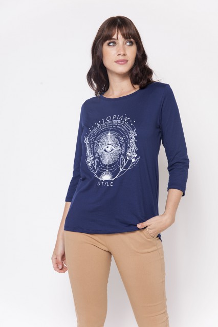 MÁS INFORMACION Realizado en Modal con Lycra gamuzado que aporta suave mano y excelente calce. Formato clásico sutilmente evasé. Manga 3/4. Cuello redondo. Ruedo irregular, trasero más largo y curvo. Estampa a contra tono en delantero. Ideal para looks con onda y super cómodos.