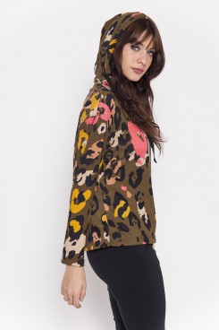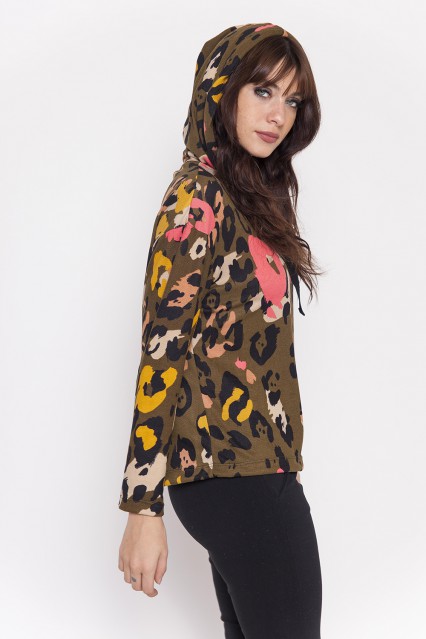 MÁS INFORMACION Realizado en Lanilla estampada con motivo animal print en una hermosa y saturada paleta de color. Prenda de formato cuadrado, oversize. Hombro caído, manga larga recta. Capucha forrada, con cinta de 2 cm de ancho. Largo a la cintura. Una prenda super canchera que no te puede faltar.